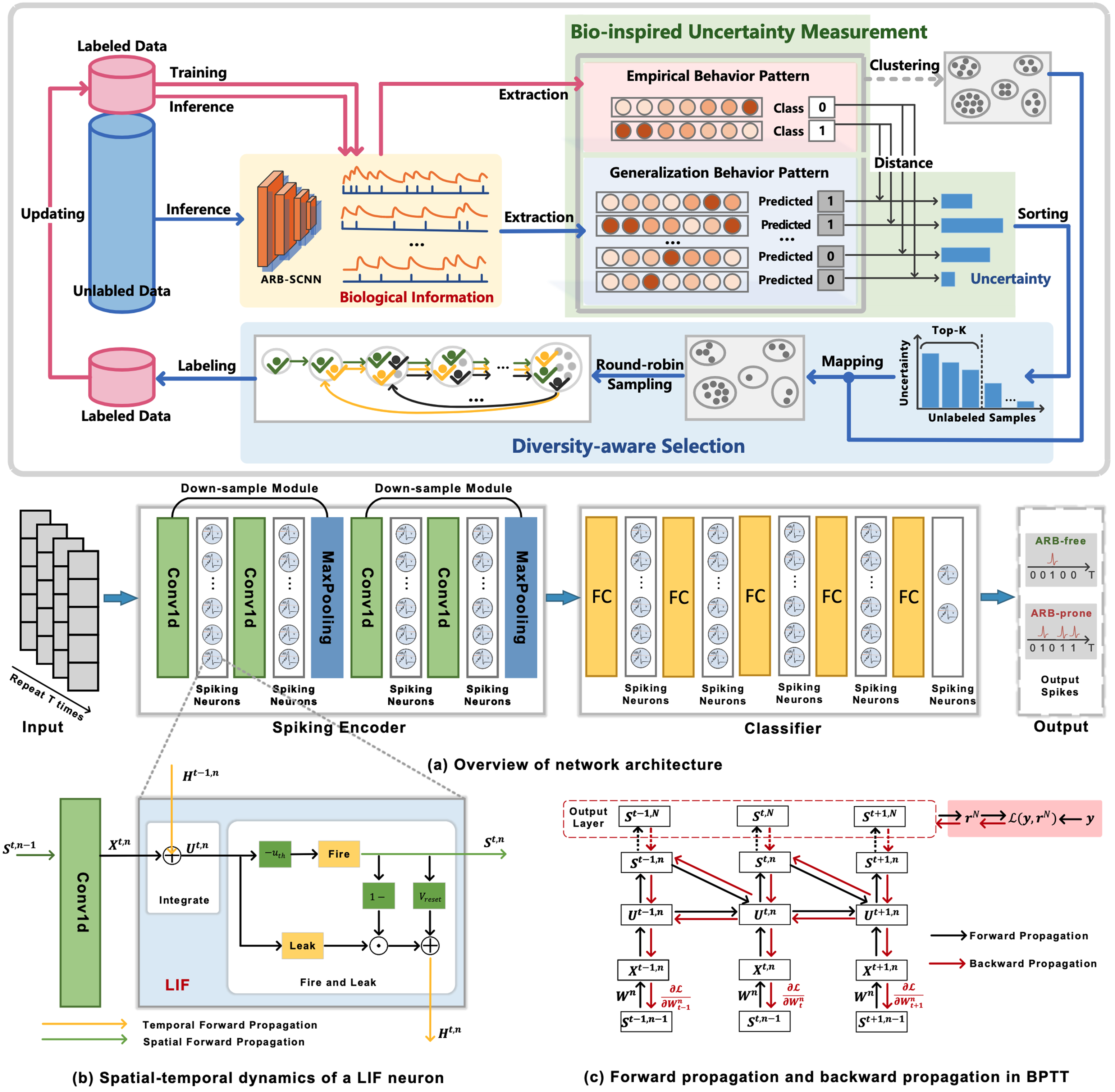To address the first issue, in our recent work (Tian et al, TETC'25, and Tian et al, ISSREW'23), we utilize the sparse and binary nature of spiking communication in Spiking Neural Networks (SNNs), which inherently provides brain-inspired regularization to effectively alleviate overfitting. Therefore, we propose a Spiking Convolutional Neural Network (SCNN)-based ARB prediction model along with a training framework that handles the model’s spatial-temporal dynamics and non-differentiable nature. To reduce labeling costs, we introduce a Bio-inspired and Diversity-aware Active Learning framework (BiDAL), which prioritizes highly informative and diverse samples, enabling more efficient usage of the limited labeling budget. This framework incorporates bio-inspired uncertainty to enhance informativeness measurement along with using a diversity-aware selection strategy based on clustering to prevent redundant labeling. Experiments on three ARB datasets show that ARB-SCNN effectively reduces overfitting, improving generalization performance by 6.65% over other DLbased classifiers. Additionally, BiDAL boosts label efficiency for ARB-SCNN training, outperforming four state-of-the-art active learning methods by 4.77% within limited labeling budgets.